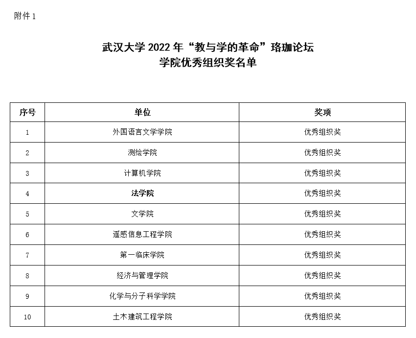 近日,武汉大学2022年“教与学的革命”珞珈论坛学院优秀组织奖及教学论文获奖名单公布。经学校组织专家对学院分论坛活动组织情况和师生论文进行严格评审,最终评选出学院优秀组织奖10项和获奖论文61篇。