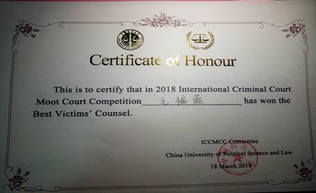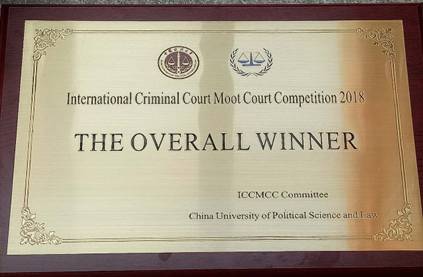 2018年3月17日至18日,国际刑事法院模拟法庭审判竞赛(International Criminal Court Moot Court Competition)中国区选拔赛(英文)于中国政法大学举行,来自全国的25支高校代表队展开了激烈角逐。经过长达六个月的集训及两天的紧张比赛,武汉大学代表队获得第三名以及全国特等奖的佳绩,并与对外经济贸易大学、中国政法大学和北京师范大学一同获得晋级国际赛的资格。