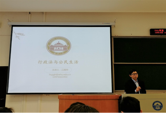主办的武汉大学法学入门系列讲座第5期在武汉大学文理学部第四教学楼201教室举行。本场讲座的主题是“行政法与公民生活”,主讲人为武汉大学人文社会科学杰出青年学者江国华教授。2019级全体本科新生参加了本场讲座。