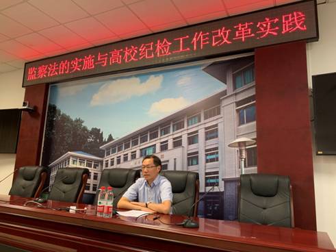 作题为“监察法的实施与高校纪检工作改革实践”的专题报告。院党委书记孙德元主持报告会,全体在校院党政班子、党委委员、教师党支部书记及部分教师党员代表与会。